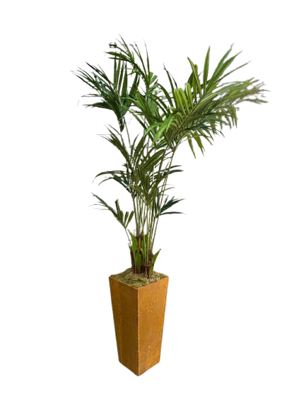 Deze mooie plantcombinatie bestaande uit een kunst Kentia in cortens staal bloempot is een mooie sfeermaker op uw event en/of bruiloft.